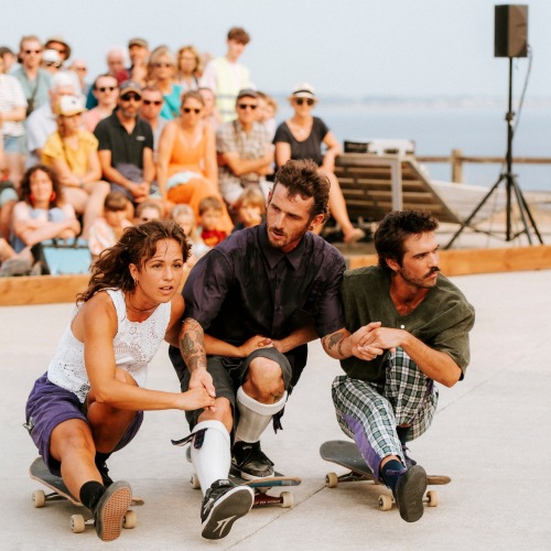 Afficher le plan1, 2, 3 : ça roule, ça danse ! Deux skateurs et une danseuse explorent la richesse de deux univers que tout semble opposer : la danse bretonne et le monde du skate ! Dans un décor aux accents rétro et une ambiance sonore décalée, la pièce interroge les liens qui fondent une communauté. Porté par une imagination débordante et l’énergie du faire ensemble, Da Gouskate ! célèbre une jeunesse joyeuse, résistante et créative.